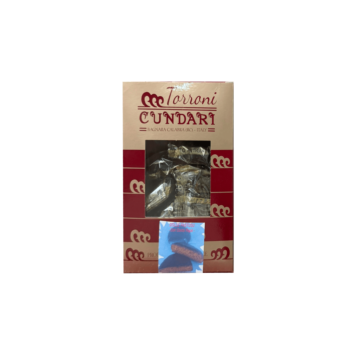 Oltre al torrone, Cundari produce una gamma di specialità tradizionali calabresi, come i piparelli, biscotti perfetti da accompagnare a un vino da dessert, le paste di mandorla, le susamelle, le scorzette d’arancio candite, i fichi secchi ricoperti di cioccolato e i mustaccioli. Nel periodo natalizio, l’azienda arricchisce la sua offerta con prodotti tipici come il Dolce pastusu e le pizze di San Martino, dolci che raccontano la cultura gastronomica calabrese e il legame profondo con le festività locali.