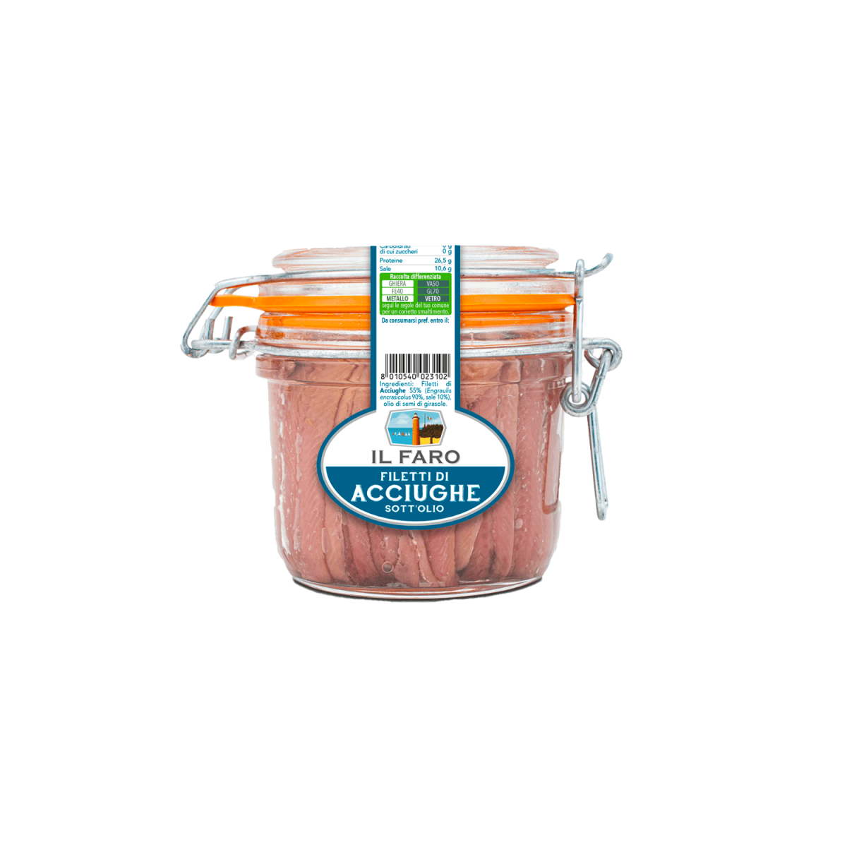 Il FaroI Filetti di Acciughe in Olio di Semi di Girasole racchiudono l’autentico sapore del mare Mediterraneo. Ottenuti da acciughe Engraulis encrasicolus, selezionate e lavorate manualmente secondo tradizione, si distinguono per la carne soda e compatta, il profumo marino intenso e il gusto equilibrato, dove la sapidità si fonde con la delicatezza dell’olio di semi di girasole. Perfetti per antipasti, bruschette, salse e primi piatti, sono un prodotto genuino e raffinato, simbolo della migliore arte conserviera italiana.