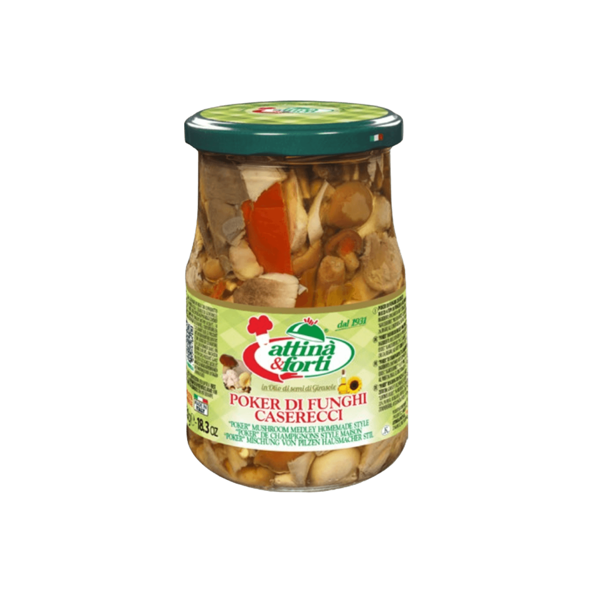 Attinà & FortiIl Poker di Funghi Caserecci di Attinà & Forti è un mix selezionato di funghi che unisce varietà e armonia in un prodotto dal carattere autentico. Alla vista si presenta con tagli irregolari e naturali, mentre al naso sprigiona profumi intensi di sottobosco e note terrose ben equilibrate. Al palato il gusto è pieno e rotondo, con consistenze diverse che si completano a vicenda. Versatile in cucina, è ideale per risotti, paste, carni, contorni, bruschette, pizze e ricette vegetariane, richiamando una tradizione casereccia genuina e ricca di sapore.