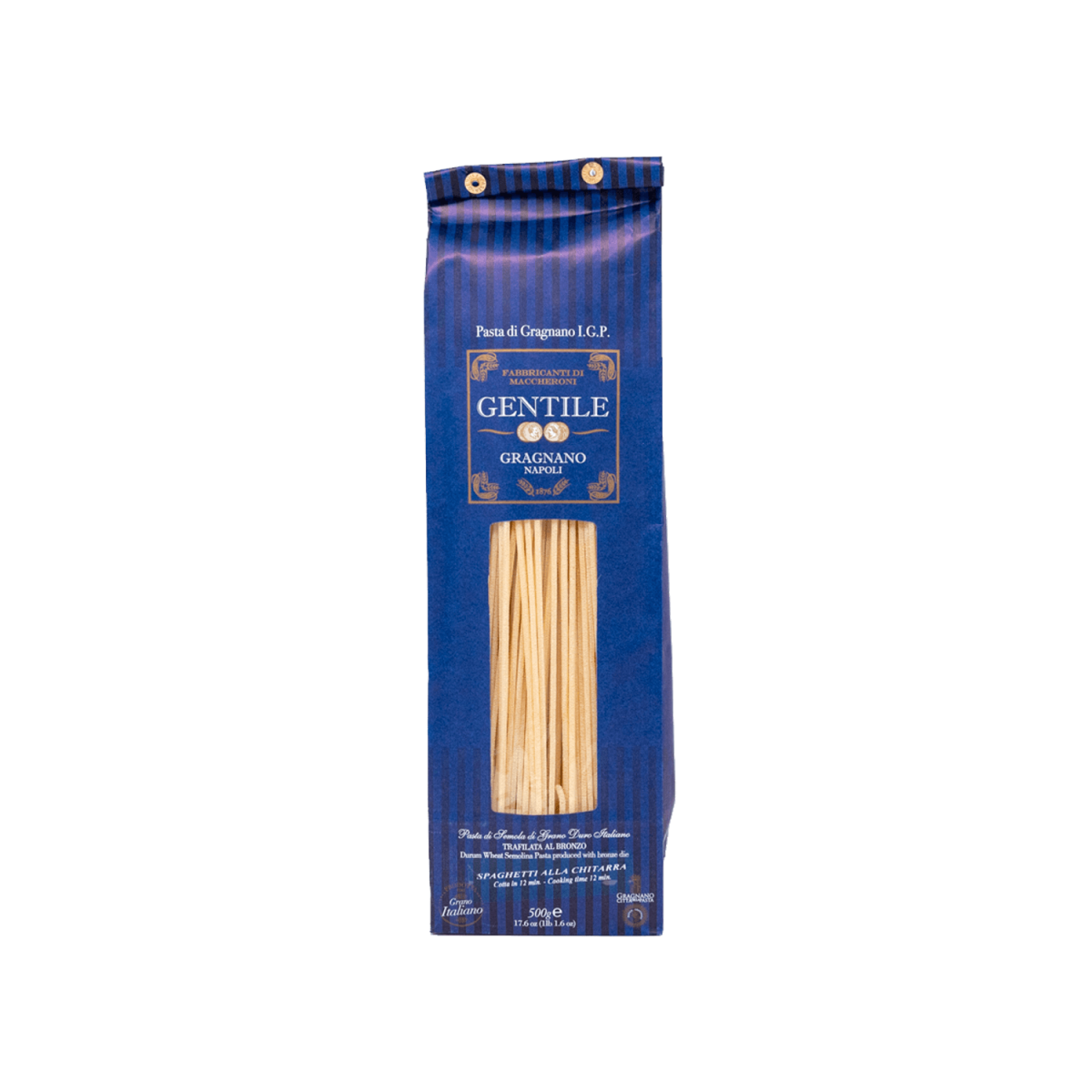 Gli Spaghetti alla Chitarra del Pastificio Gentile rappresentano una delle più autentiche espressioni della tradizione pastaia italiana. Nati nel cuore di Gragnano, capitale storica della pasta, sono proposti in confezione da 500 g e realizzati con semola di grano duro e acqua pura delle sorgenti dei Monti Lattari, secondo la ricetta classica che da generazioni distingue il marchio Gentile.