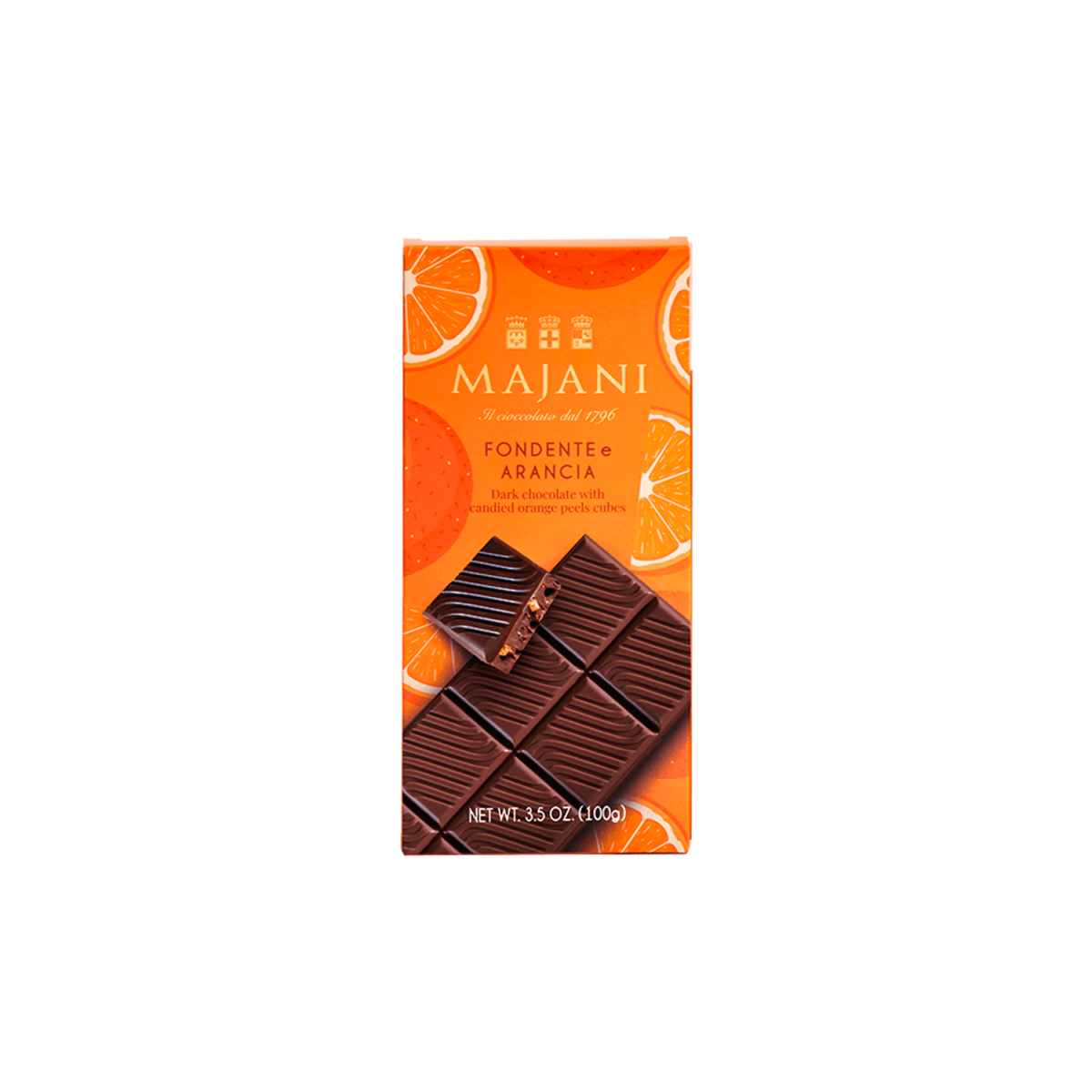 La Tavoletta Majani Fondente e Arancia è un connubio raffinato che esalta l’arte del cioccolato attraverso un gioco di contrasti perfettamente equilibrati. Il finissimo cioccolato fondente extra (53% cacao minimo) incontra la vivacità aromatica delle scorzette di arancia candita (11%), creando un’esperienza sensoriale complessa e avvolgente, in cui profondità e luminosità convivono con naturale eleganza.
